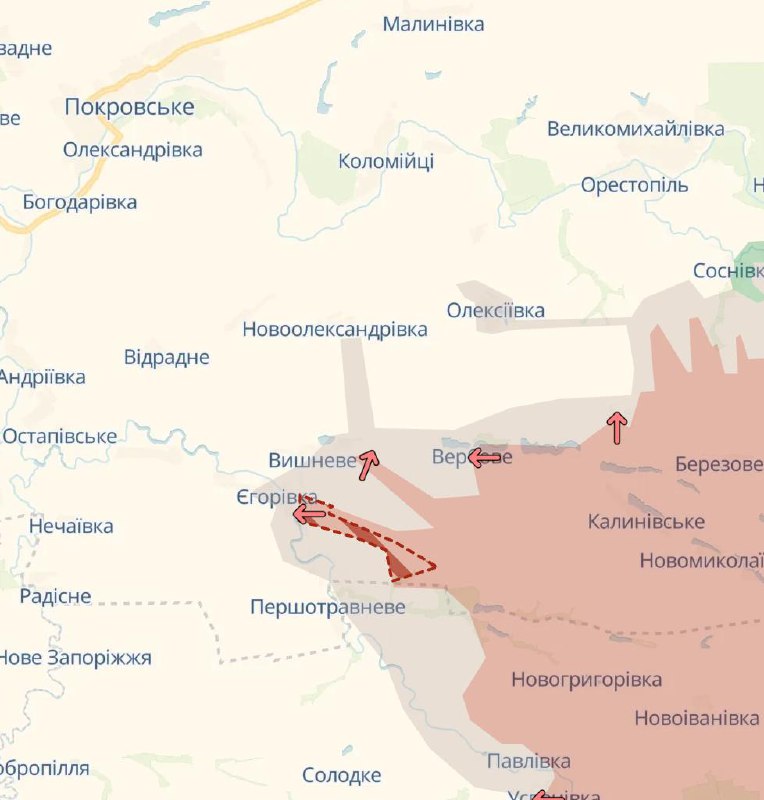 12.39 Армия РФ продвинулась в Днепропетровской области южнее Покровского и на границе Харьковской области, соединив свой плацдарм в Меловом с основными захваченными территориями, сообщает Deep State.