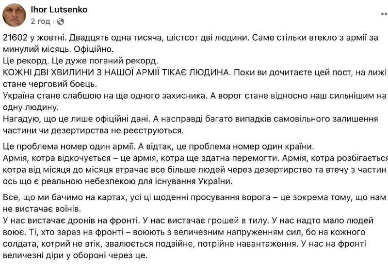 "Каждые две минуты из нашей армии бежит человек. Это только официальные данные. А на самом деле много случаев самовольного ухода из части или дезертирства не регистрируют. Это проблема номер один в армии. Откатывающаяся армия - это армия, которая еще способна победить. Разбегающаяся армия, которая от месяца к месяцу теряет все больше людей из-за дезертирства и бегства из частей, - вот это реальная опасность для существования Украины", - написал Луценко.
