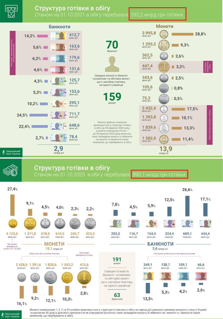 НБУ сообщил, что на 1 октября 2025 год на купюры достоинством 500 грн и 1000 грн, приходилось, соответственно, 26,6% и 17,1% (43,7% вместе) всего банкнотного ряда. В то время как перед войной показатели были в 1,7 раза меньше: 22,4% на 500 грн и 2,7% на 1000 грн, то есть 25,1% всех банкнот.
