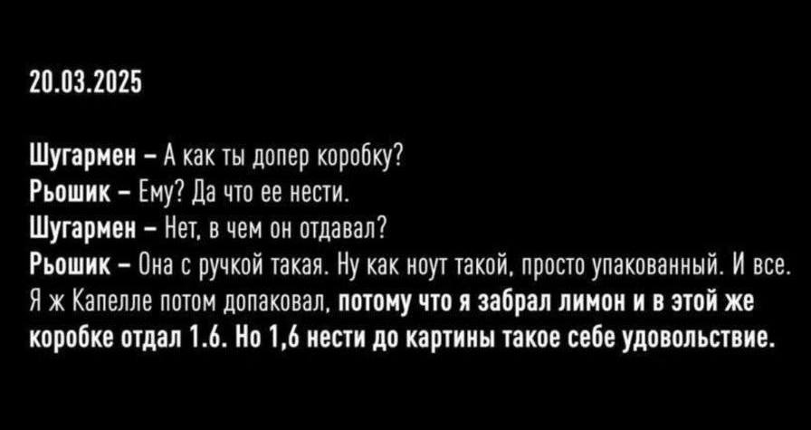 "Она с ручкой такая. Ну как ноут такой, просто упакованный. И все. Я ж Капелле потом допаковал, потому что я забрал лимон и в этой же коробке отдал 1,6. Но 1,6 нести до картины такое себе удовольствие", – ответил Рёшик.