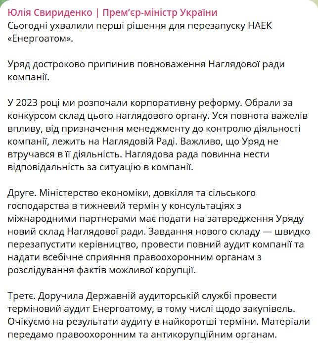Также Свириденко поручила Государственной аудиторской службе провести срочный аудит "Энергоатома", в том числе по закупкам.
