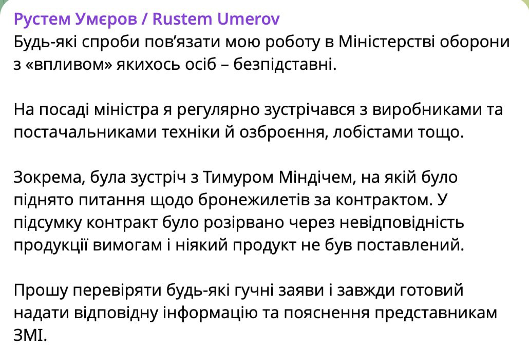 "В частности, была встреча с Тимуром Миндичем, на которой был поднят вопрос о бронежилетах по контракту. В результате контракт был расторгнут из-за несоответствия продукции требованиям и никакой продукт не был поставлен", – сообщил Умеров.