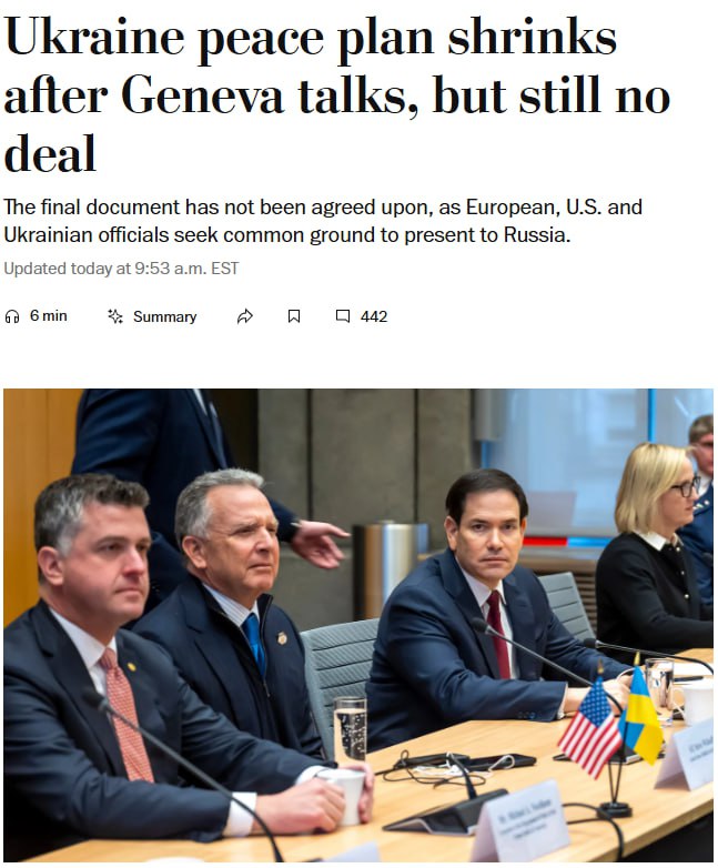 При этом The Washington Post сообщает, что США и Украина ещё не согласовали итоговую версию мирного плана и его обсуждение идет на основе предложений США, а не Европы.