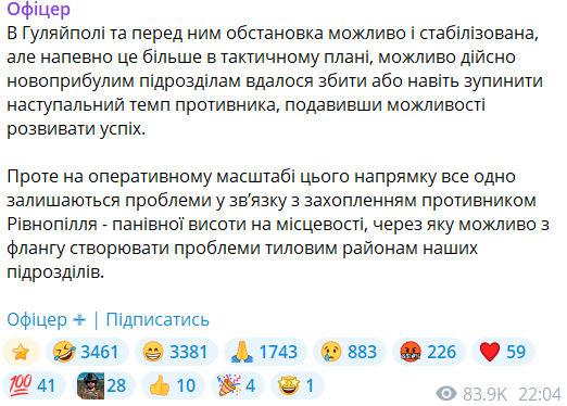 "В Гуляйполе и перед ним обстановка, возможно, и стабилизирована, но наверняка это больше в тактическом плане, возможно, действительно новоприбывшим подразделениям удалось сбить или даже остановить наступательный темп противника, подавив возможности развивать успех. Однако на оперативном масштабе этого направления все равно остаются проблемы в связи с захватом противником Ровнополья - господствующей высоты на местности, из-за которой возможно с фланга создавать проблемы тыловым районам наших подразделений", - написал военный.