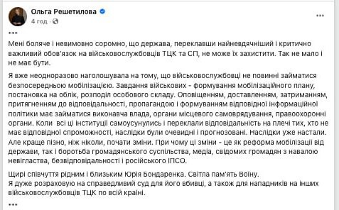 Об этом заявила военная омбудсмен Ольга Решетилова после убийства сотрудника ТЦК во Львове.