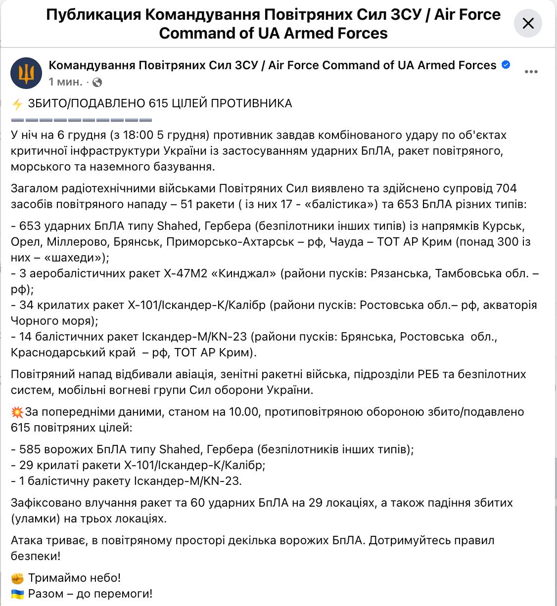 Ночью и утром 6 декабря Украину атаковали более 700 целей.