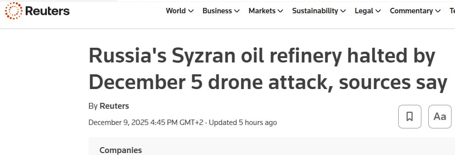 22.14 Нефтеперерабатывающий завод в российской Сызрани прекратил переработку нефти после того, как 5 декабря был повреждён в результате атаки украинских дронов, сообщили Reuters два источника в отрасли.