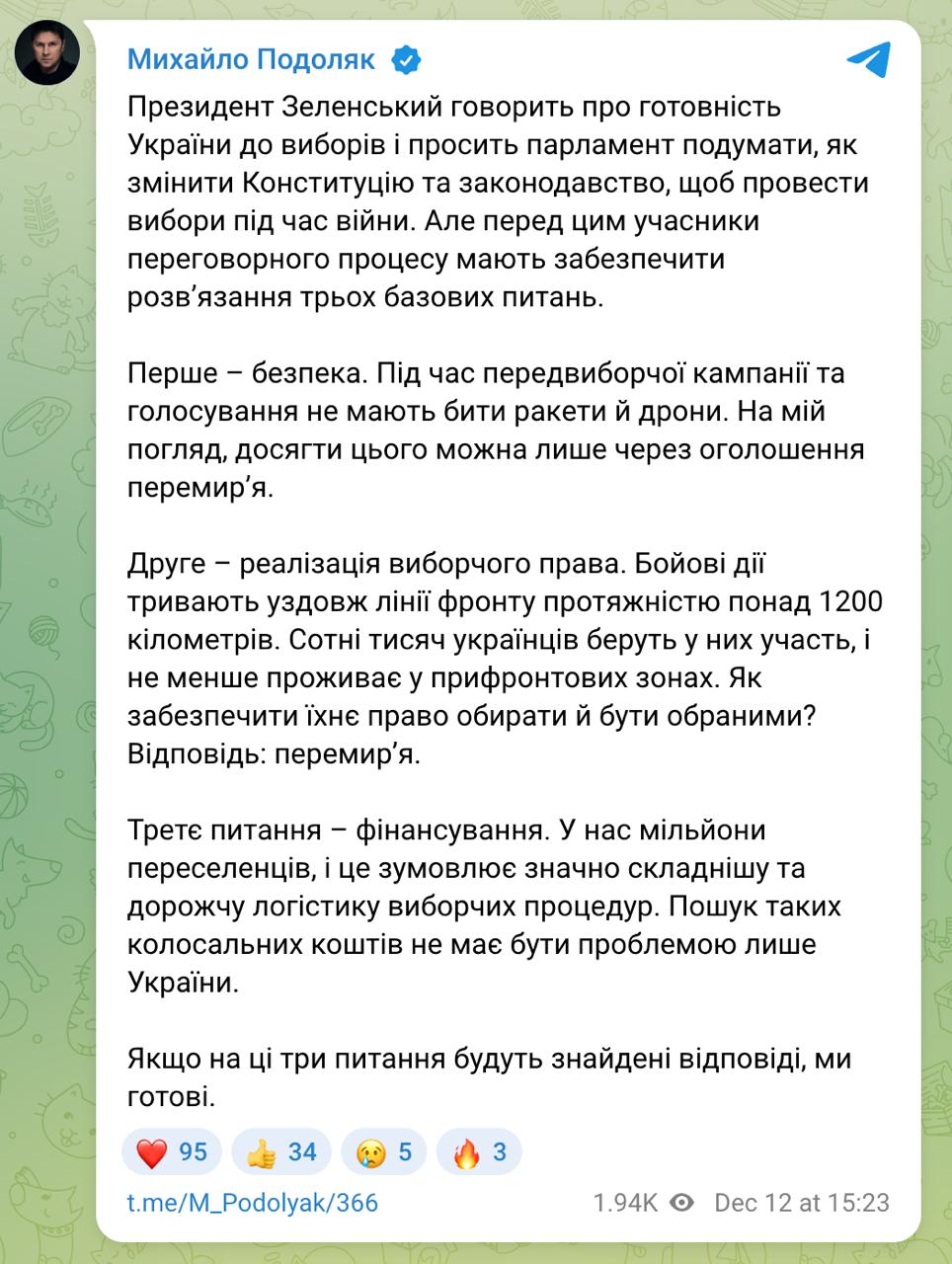 "Во время предвыборной кампании и голосования не должны бить ракеты и дроны. На мой взгляд, добиться этого можно только через объявление перемирия. Боевые действия продолжаются вдоль линии фронта протяженностью более 1200 км. Сотни тысяч украинцев участвуют в них, и не меньше проживает в прифронтовых зонах. Как обеспечить их право выбирать и быть избранными? Ответ: перемирие", - написал Подоляк.
