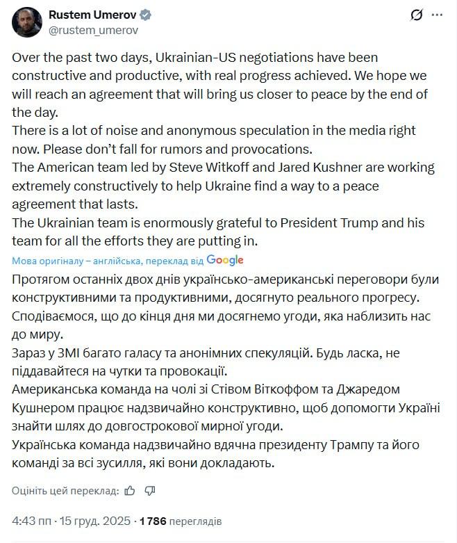 "За последние два дня украинско-американские переговоры были конструктивными и продуктивными, достигнут реальный прогресс. Мы надеемся, что к концу дня мы достигнем соглашения, которое приблизит нас к миру", - пишет секретарь СНБО и глава переговорной делегации.