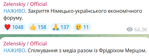 Между тем, исходя из сообщений в официальном телеграм-канале Зеленского, президент Украины вместе с канцлером ФРГ Фридрихом Мерцем общается с прессой на закрытии немецко-украинского экономического форума.