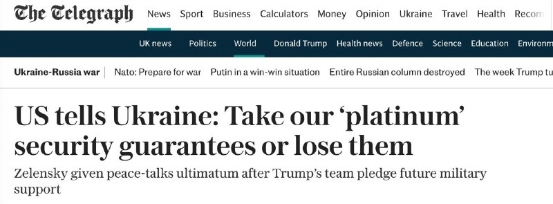 The Telegraph также пишет, что США предъявили Владимиру Зеленскому ультиматум: мол, принимайте наши гарантии безопасности, иначе вы их потеряете. Американцы считают предложенные гарантии по типу 5-й статьи НАТО "платиновым стандартом". Источники в США заявили, что это предложение стало "крупнейшей победой для Украины и для Европы на сегодняшний день" в мирных переговорах.