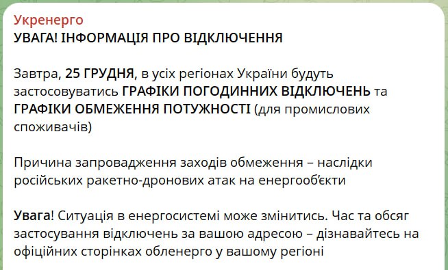 18.44 Графики отключения света завтра будут действовать во всех регионах, сообщает "Укрэнерго".
