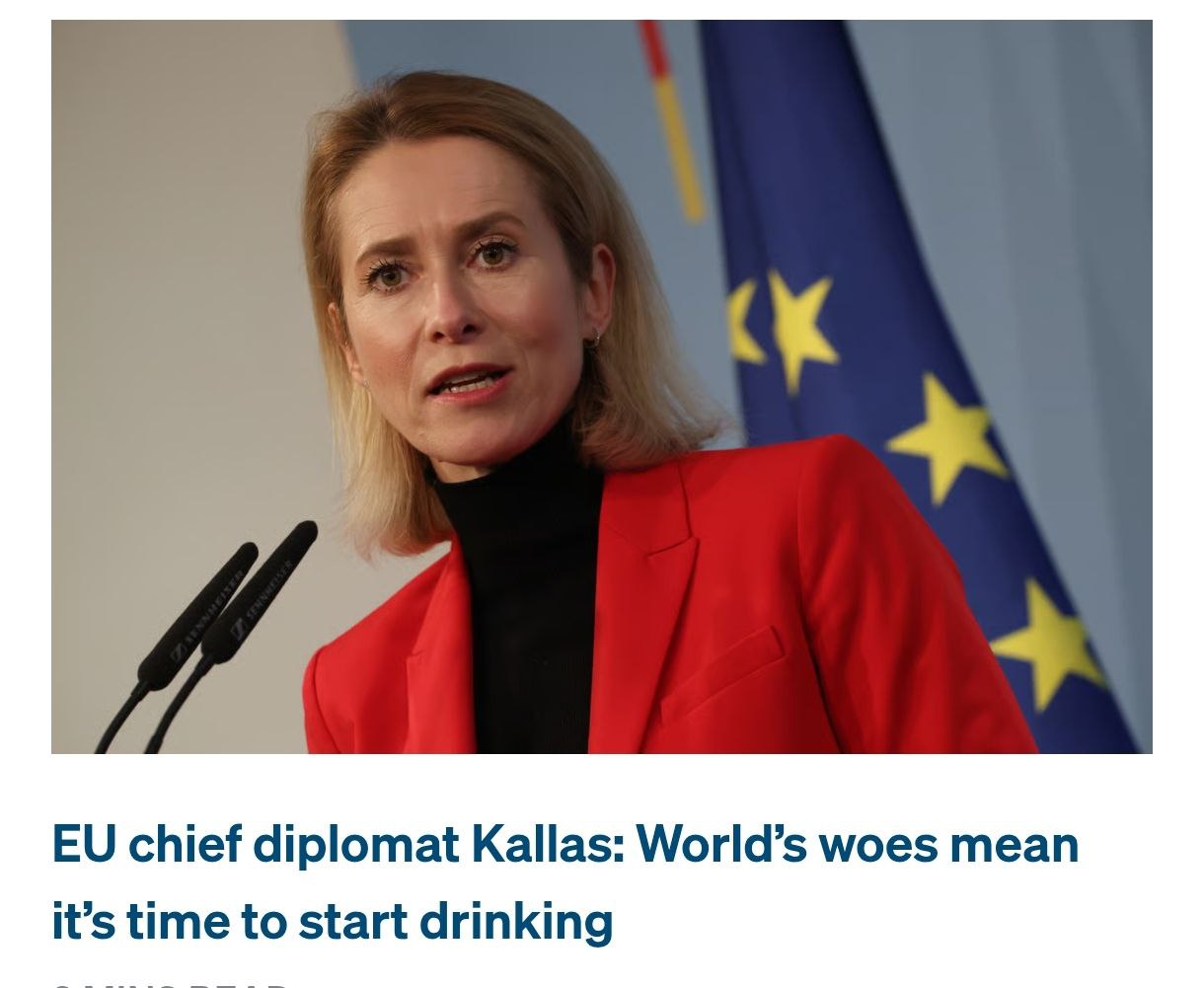 Верховный представитель Европейского Союза по иностранным делам и политике безопасности Кая Каллас во время встречи с политическими группами Евросовета в шутку заявила, что из-за ситуации в мире сейчас самый подходящий момент, чтобы начать пить.