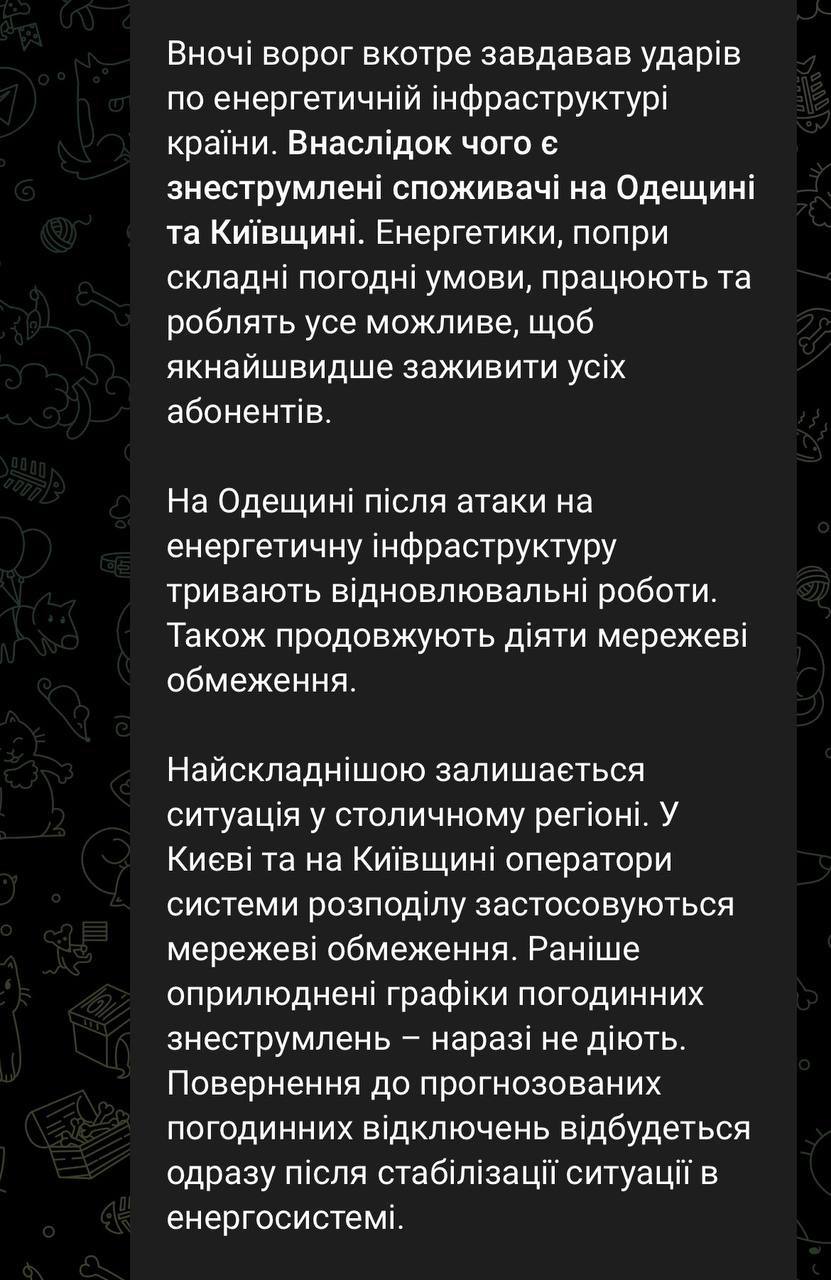 Поступают последние новости об энергообеспечении столицы и регионов Украины.