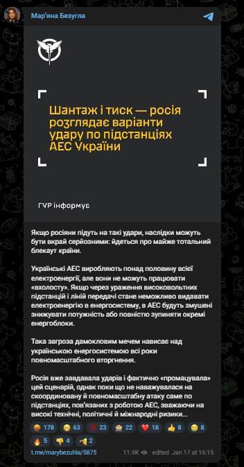 14:02 Нардеп Марьяна Безуглая заявляет о том, что возможные удары по подстанциям АЭС, о которых заявляли в ГУР Украины, могут иметь крайне серьезные последствия, вплоть до тотального блэкаута всей страны.