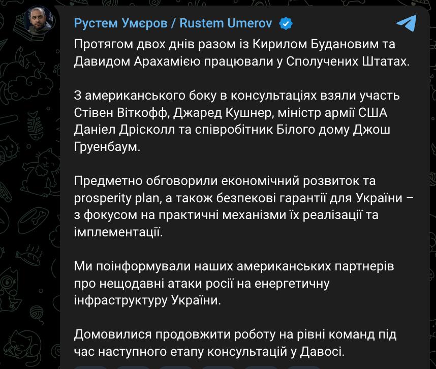 "Предметно обсудили экономическое развитие и план процветания (prosperity plan), а также гарантии безопасности для Украины – с фокусом на практические механизмы их реализации и имплементации… Договорились продолжить работу на уровне команд на следующем этапе консультаций в Давосе", – заявил секретарь СНБО.