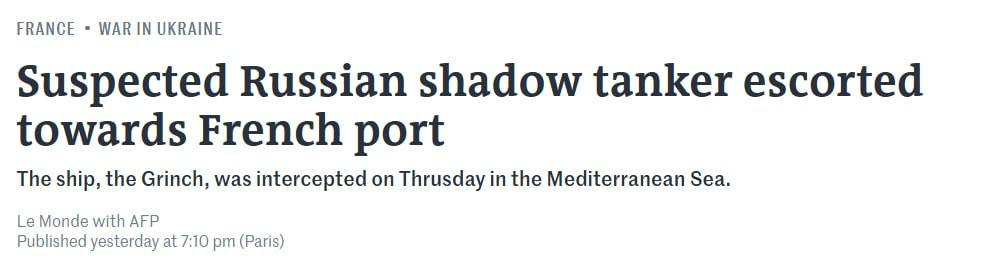 "В префектуре заявили, что вокруг места стоянки установлены морские и воздушные зоны отчуждения. Около 598 судов, подозреваемых в принадлежности к "теневому флоту", находятся под санкциями Евросоюза. Власти заявили, что 249-метровое судно Grinch фигурирует под этим именем в британском санкционном списке российских судов "теневого флота", а под именем "Карл" в списках, составленных ЕС и США", - заявляет Le Monde.