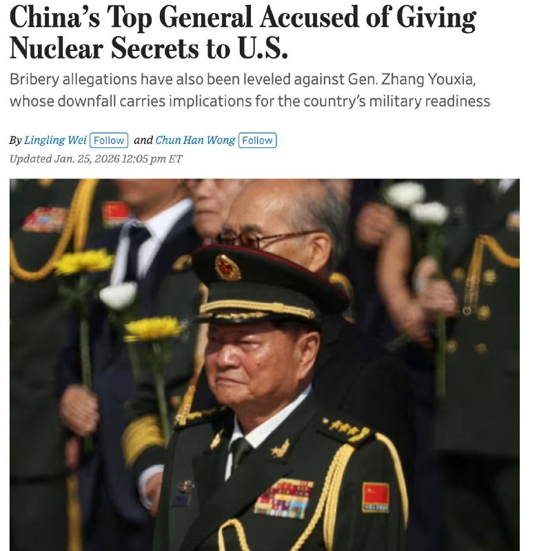 Заместителя председателя Центральной военной комиссии (ЦВК) и члена политбюро Коммунистической партии Китая, который считался доверенным военным советником Си Цзиньпина, Чжана Юся подозревают в передаче США ключевой технической информации о китайском ядерном оружии. Также его обвиняют во взяточничестве.
