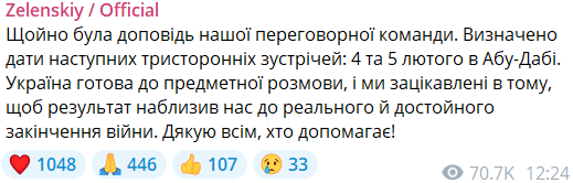 "Только что был доклад нашей переговорной команды. Определены даты следующих трехсторонних встреч: 4 и 5 февраля в Абу-Даби. Украина готова к предметному разговору, и мы заинтересованы в том, чтобы результат приблизил нас к реальному и достойному завершению войны", - пишет Зеленский.