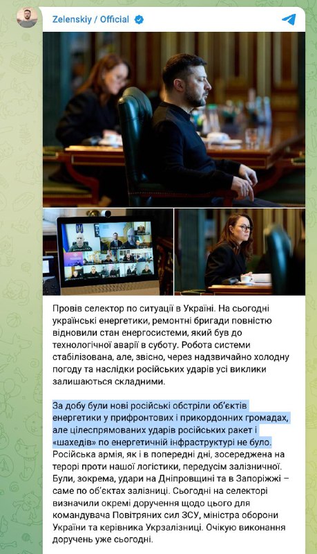 А вот Владимир Зеленский на селекторном совещании, посвященном ситуации в энергетике, заявил, что Россия не специально била по упомянутым объектам после завершения энергетического перемирия.