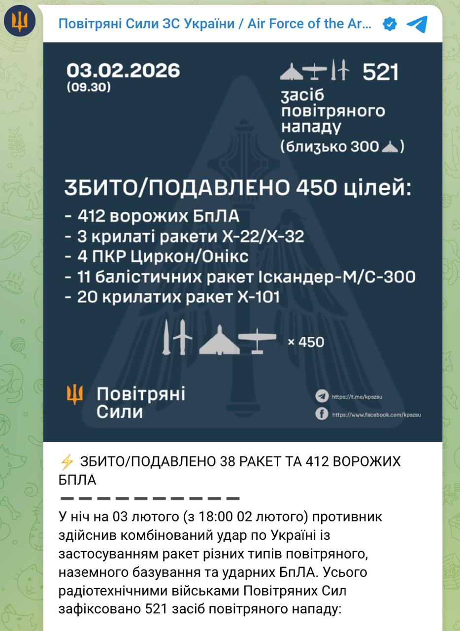 9.30 РФ этой ночью выпустила по энергетике Украины более 70 ракет, в том числе большое количество баллистических, и 450 БпЛА, сообщает Зеленский.