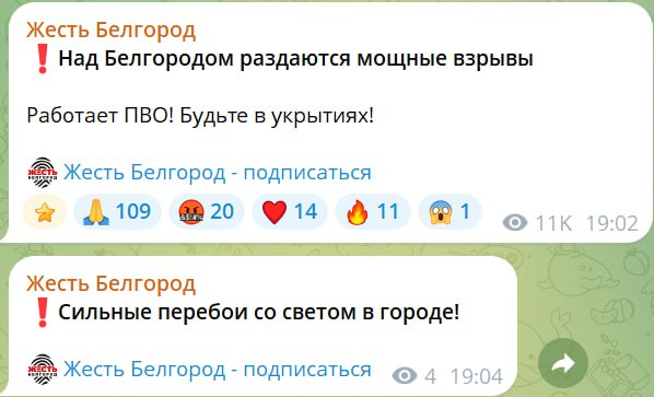 19.12 В Белгороде звучат взрывы. Местные паблики пишут о ракетной атаке и о работе ПВО. Они сообщают, что в части города пропал свет. Также пишут и о перебоях с водой.