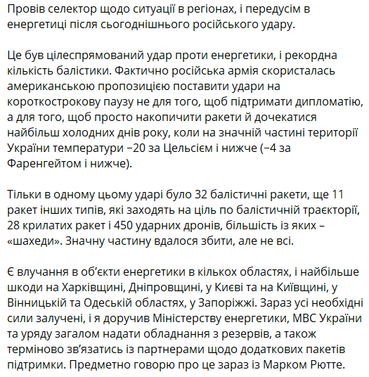 "Фактически российская армия воспользовалась американским предложением поставить удары на краткосрочную паузу не для того, чтобы поддержать дипломатию, а для того, чтобы просто накопить ракеты и дождаться наиболее холодных дней года, когда на значительной части территории Украины температура -20 по Цельсию и ниже", - написал президент.