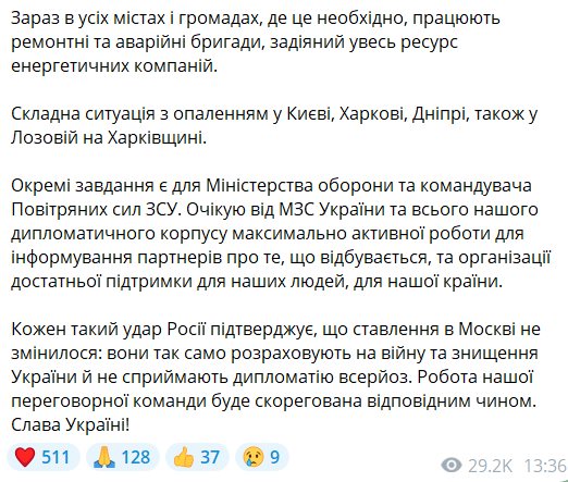 "Есть попадания в объекты энергетики в нескольких областях, и наибольший ущерб на Харьковщине, Днепровщине, в Киеве и на Киевщине, в Винницкой и Одесской областях, в Запорожье. Каждый такой удар России подтверждает, что отношение в Москве не изменилось: они так же рассчитывают на войну и уничтожение Украины и не воспринимают дипломатию всерьёз. Работа нашей переговорной команды будет скорректирована соответствующим образом", - заявил Зеленский.