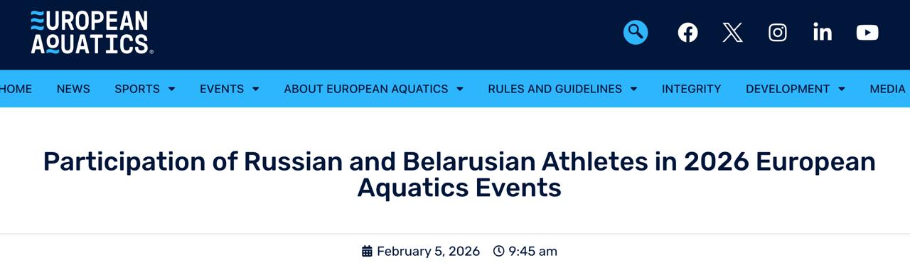 "Спортсмены с российским или белорусским паспортом, выступающие в молодежных и юниорских категориях, больше не будут подпадать под ограничения в отношении участия в европейских соревнованиях по водным видам спорта как в индивидуальных, так и в командных соревнованиях. Российские и белорусские спортсмены будут допущены без проверки биографических данных и в полном соответствии с европейскими протоколами, касающимися флагов, гимнов, униформы и сопутствующих элементов", - сообщает федерация.