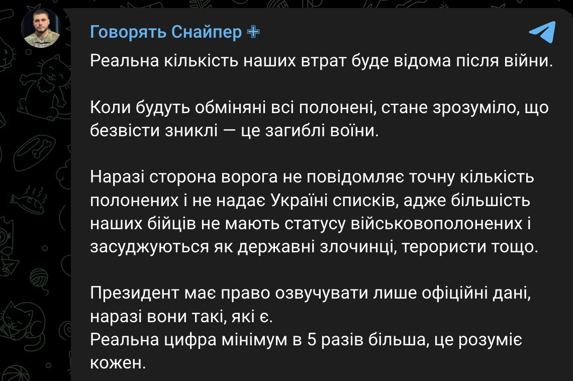 Военный пишет, что реальная цифра погибших будет выше из-за пропавших без вести, которых президент в свою статистику не включил.