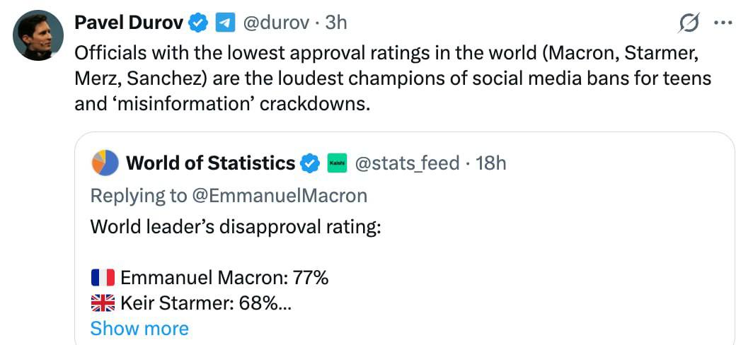 "Чиновники с самыми низкими рейтингами одобрения в мире (Макрон, Стармер, Мерц, Санчес) громче всех выступают за запреты соцсетей для подростков и за борьбу с "дезинформацией", - заявил Дуров.