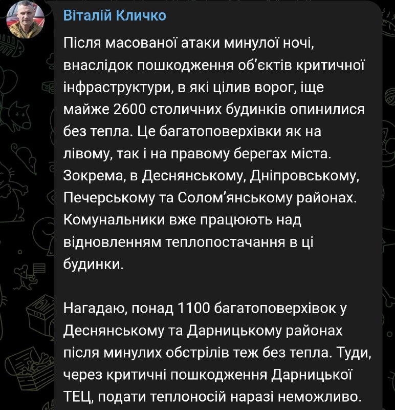 09:00 В Киеве 3700 жилых домов остались без тепла после ночного удара, сообщил Кличко. Из них 2600 домов в Деснянском, Днепровском, Печерском и Соломенском районах.
