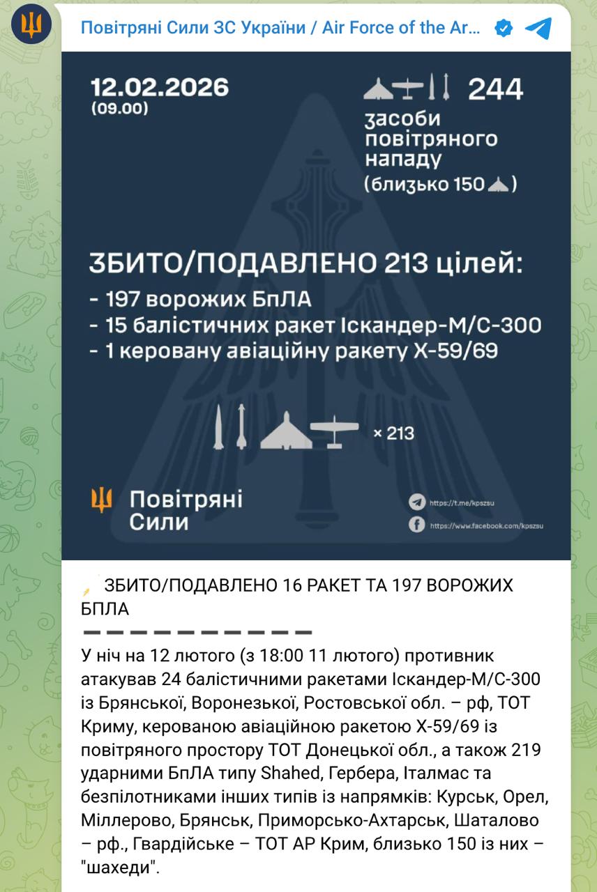 Также были сбиты единственная авиаракета и 197 ударных БпЛА из 219.
