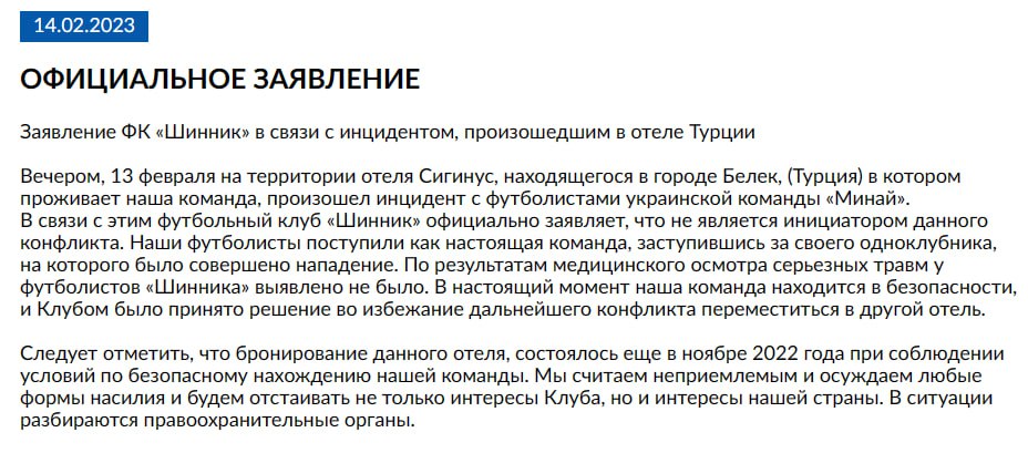 Пізніше з'явилася офіційна заява "Шинника". Там наполягають, що конфлікт затіяли українці. При цьому у заяві звучить фраза про "підтримку нашої країни".