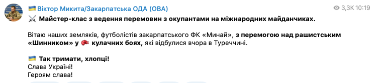 "Майстер-клас із ведення переговорів з окупантами на міжнародних майданчиках. Вітаю наших земляків, футболістів закарпатського ФК "Мінай", з перемогою над рашистським "Шинником" у кулачних боях, що відбулися вчора в Туреччині", - написав Микита.