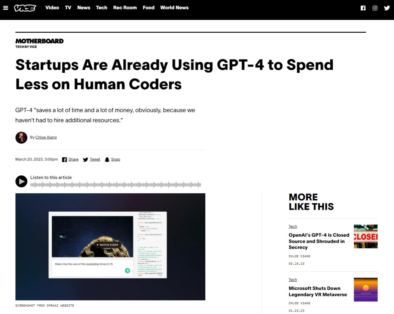 Видання Vice наводить слова стартапера Джо Перкінса, який стверджує, що витратив на розробку коду за допомогою ChatGPT три години та 11 центів.