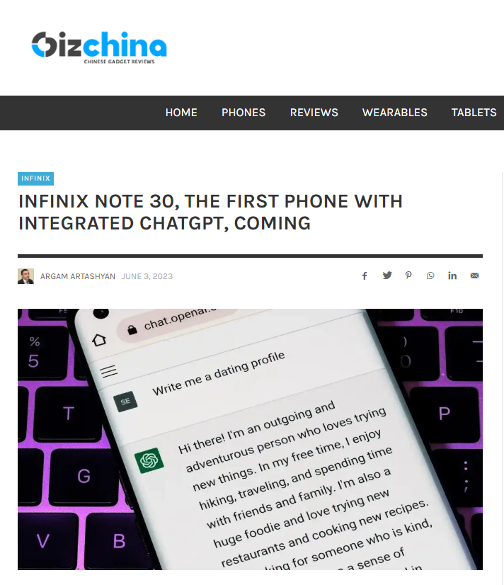 Першими гаджетами із встановленим ChatGPT стануть смартфони серії Infinix Note 30. При цьому ChatGPT буде не просто вбудований в ОС, а й об'єднаний із фірмовим голосовим асистентом Folax, що дасть користувачам набагато більше можливостей. Все це буде абсолютно безкоштовно і без необхідності реєстрації облікового запису в сервісі OpenAI.