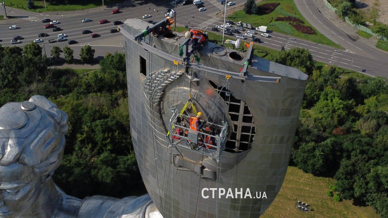 У Києві продовжуються роботи з демонтажу радянського герба зі щита монумента Батьківщина-мати. Його замінять тризубом.