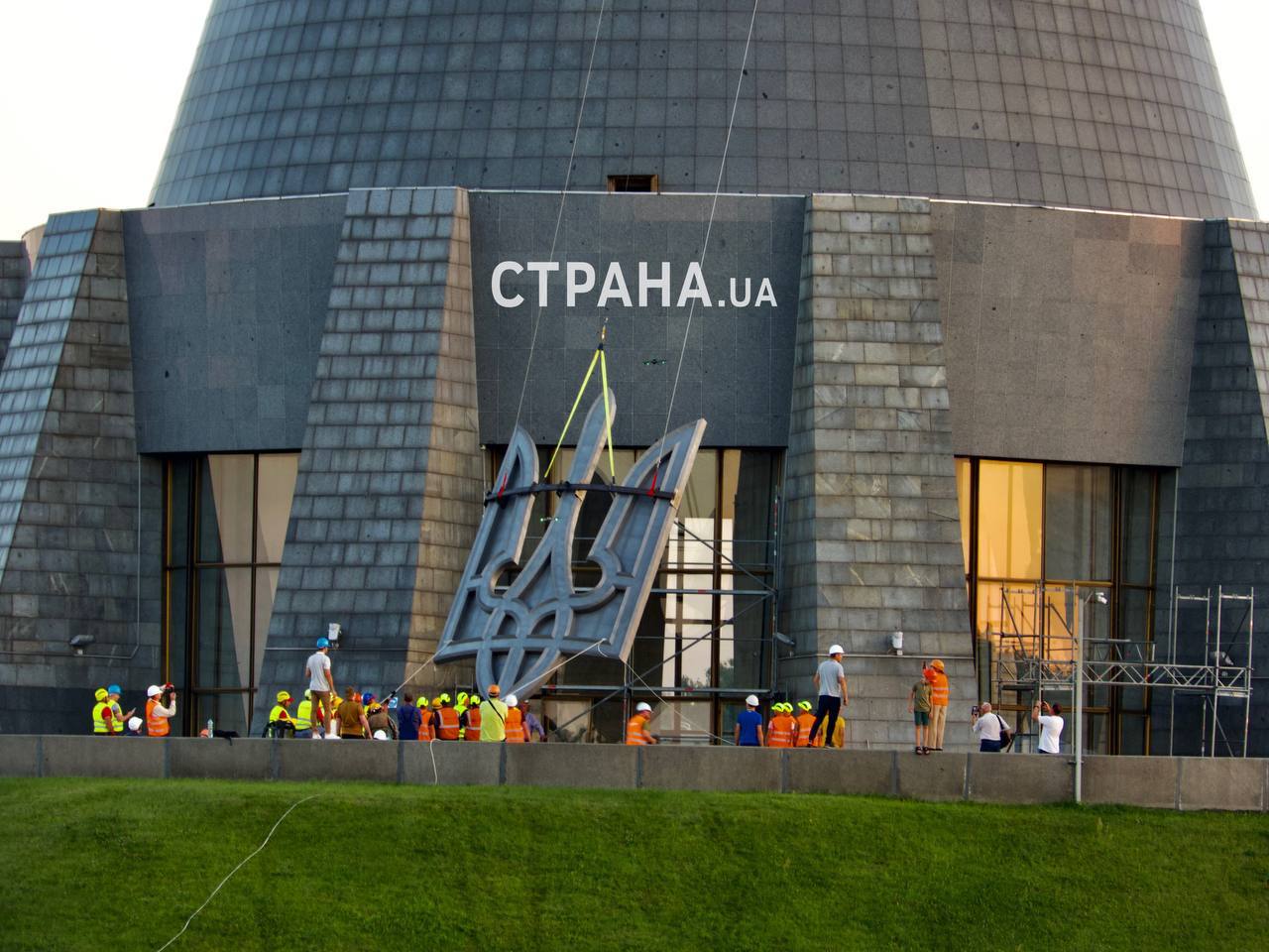 Біля монумента "Батьківщина-Мати" розпочали підняття українського герба, який встановлять на щит. Відео та фото