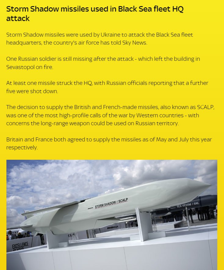 Раніше оглядач BBC News з питань озброєнь Кріс Партрідж припустив, що удару по штабу Чорноморського флоту було завдано або британської, або української ракети.