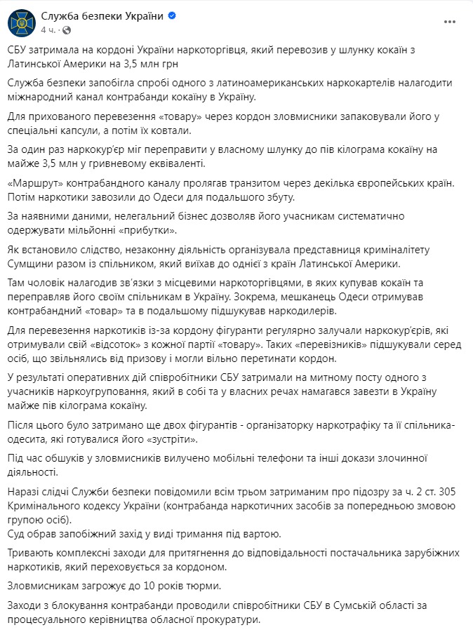 Як встановило слідство, незаконну діяльність організувала представниця криміналітету Сумщини разом із спільником, який виїхав до однієї з країн Латинської Америки. Там чоловік налагодив зв'язки з місцевими наркоторговцями, де купував кокаїн та переправляв його своїм спільникам до України. Житель Одеси підшукував наркодилерів – серед осіб, які звільнені від призову та можуть вільно перетинати кордон. Наркокур'єри отримували відсоток із кожної партії товару.