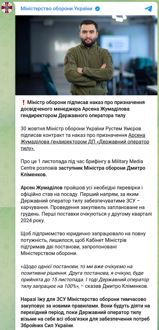 Гендиректором держпідприємства "Державний оператор тилу", яке займатиметься всіма закупівлями Міноборони, призначили Арсена Жумадилова.