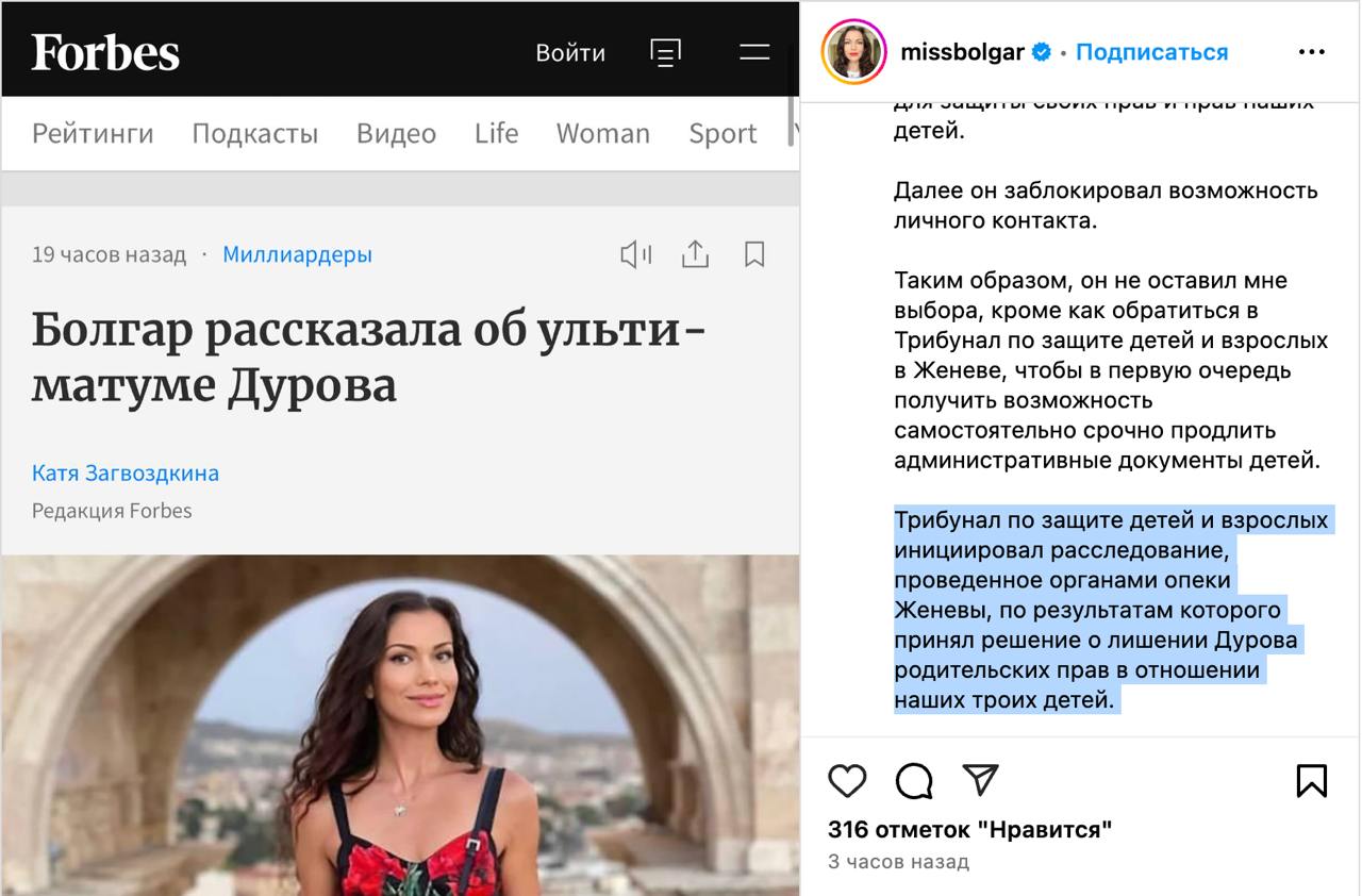 Про це заявила в Інстаграмі Ірина Болгар, яка називає себе матір'ю дітей засновника Телеграма.