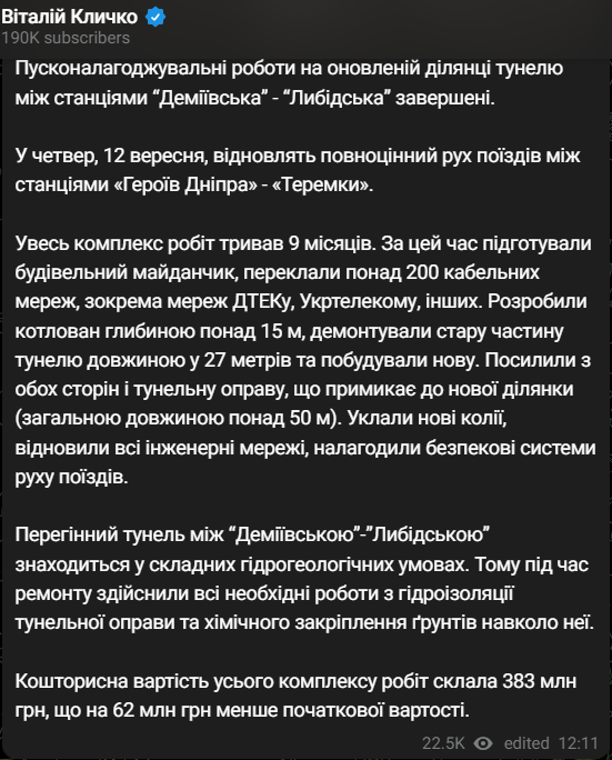 "Перегінний тунель між "Деміївською"-"Либідською" знаходиться у складних гідрогеологічних умовах. Тому при ремонті здійснили всі необхідні роботи з гідроізоляції тунельної оправи та хімічного закріплення ґрунтів навколо неї", - написав мер.