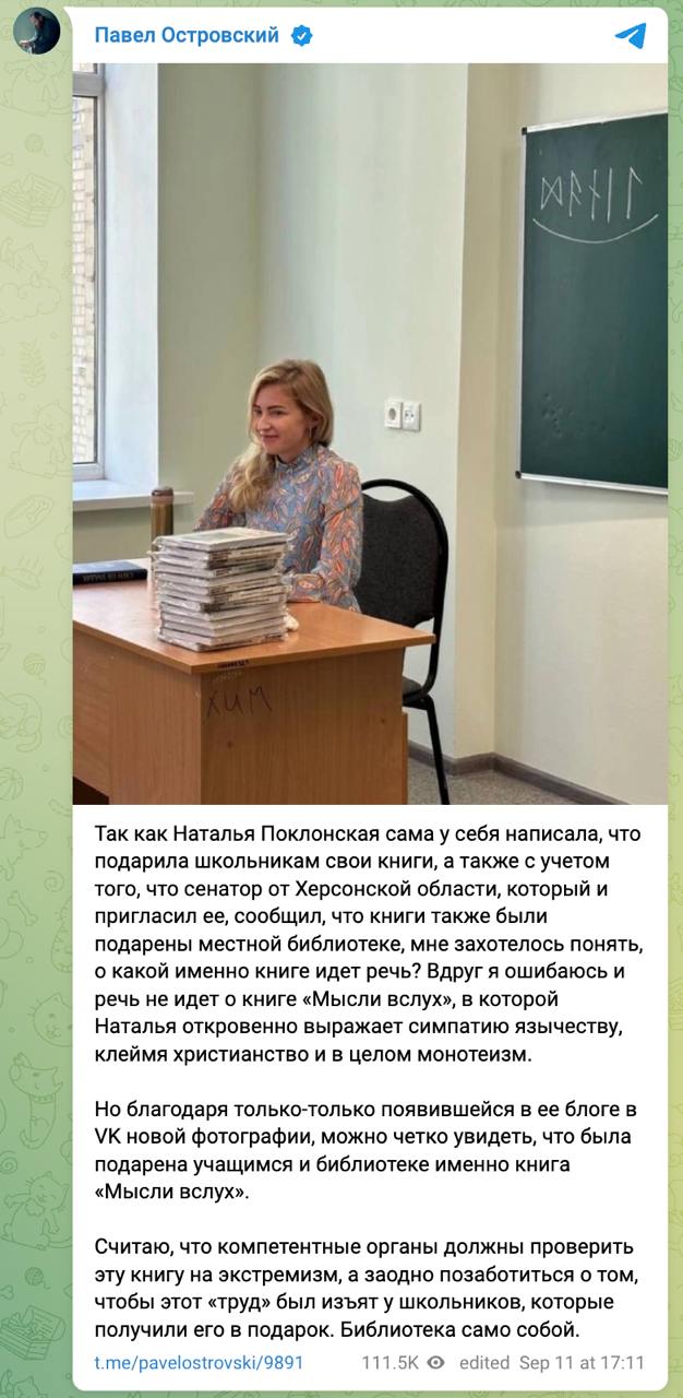 Відомий російський священик-інстаблогер Павло Островський закликав правоохоронців перевірити її книгу "Думки вголос", оскільки, на його думку, у цій книзі Поклонська критикує християнство, пропагує язичництво, "пересмикує факти та розпалює релігійну ворожнечу".