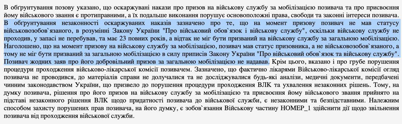 "На момент призову позивач не мав статусу військовозобов'язаного відповідно до закону України "Про військовий обов'язок та військову службу", оскільки військову службу не проходив, у запасі не був і має 23 повні роки, а тому не міг бути призваний на військову службу за загальною мобілізацією", - пояснив суд.