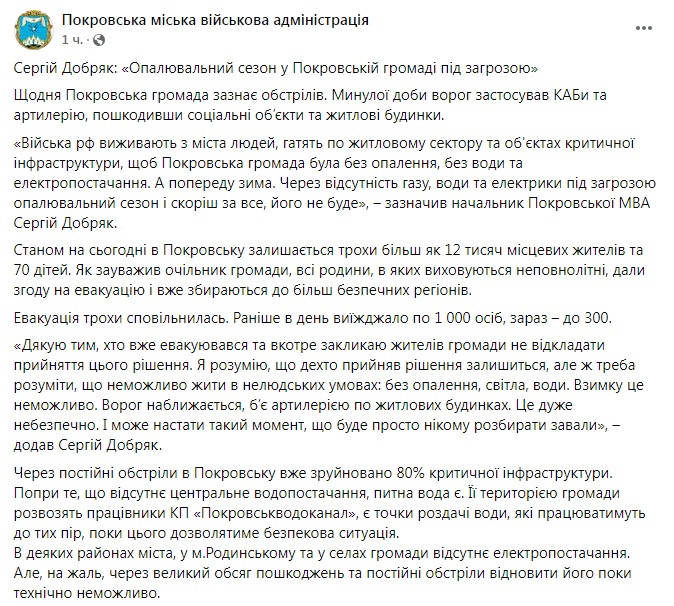 "Війська РФ виживають із міста людей, б'ють по житловому сектору та об'єктах критичної інфраструктури, щоб Покровська громада була без опалення, без води та електропостачання. А попереду зима. Через відсутність газу, води та електрики під загрозою опалювальний сезон і швидше за все, його не буде", - сказав Добряк.