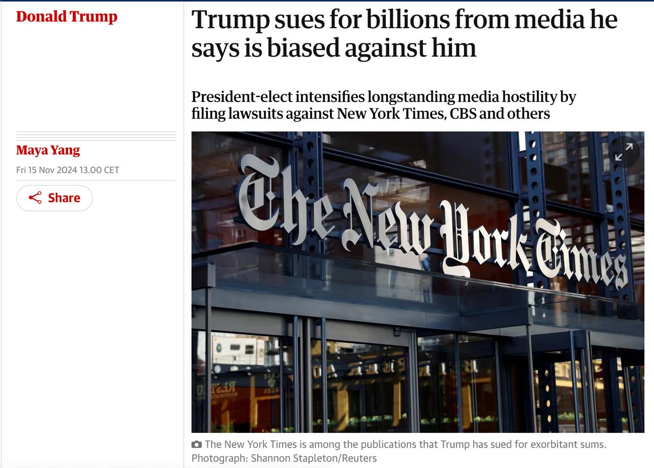 Після перемоги на виборах Трамп звинуватив американські видання у цькуванні та подав проти них мільярдні позови
