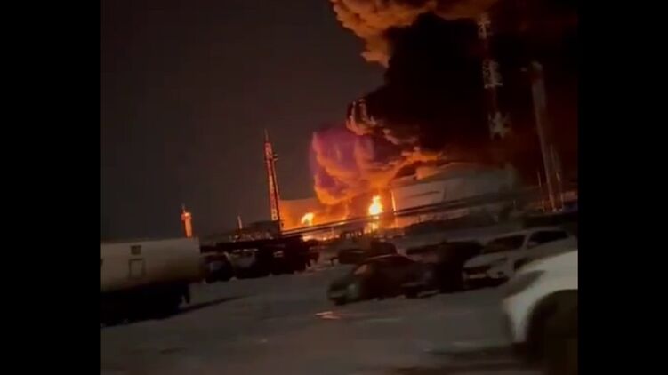 Телеграм-канали публікують кадри нафтобази, що горить.