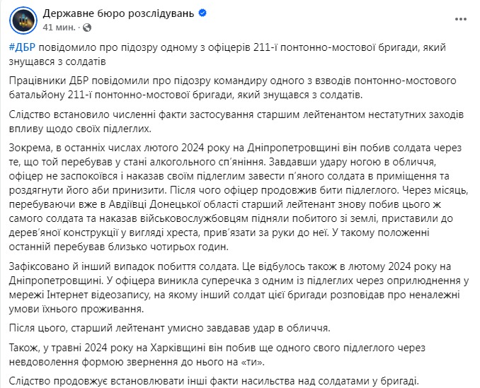 Командир одного зі взводів 211-ї понтонно-мостової бригади отримав підозру у знущанні з солдатів. За даними ЗМІ, йдеться про старшого лейтенанта Владислава Пастуха.
